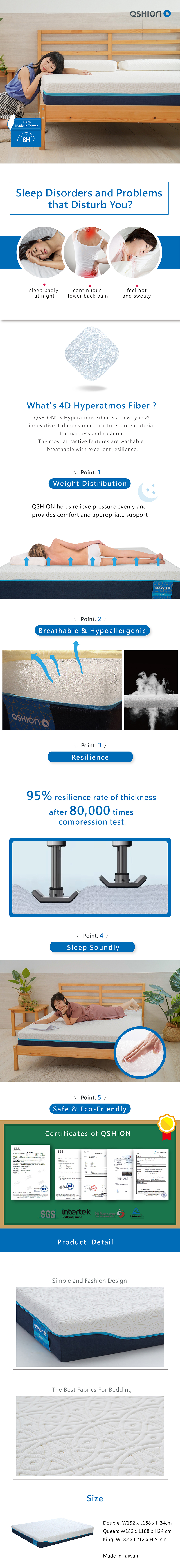 QSHION 採用4D高涵氧空氣纖維,依照不同密度與厚度,組合出能分層承托身體重量的床墊本體。有效釋放身體壓力,真正緩解身體的疲勞,為良好的睡眠做足準備。